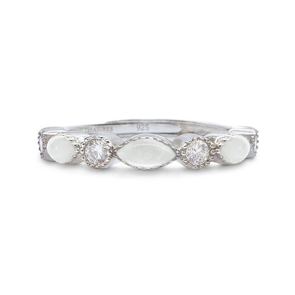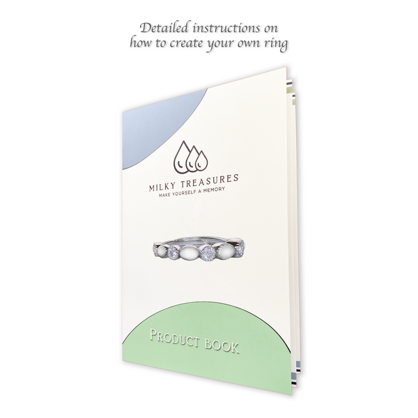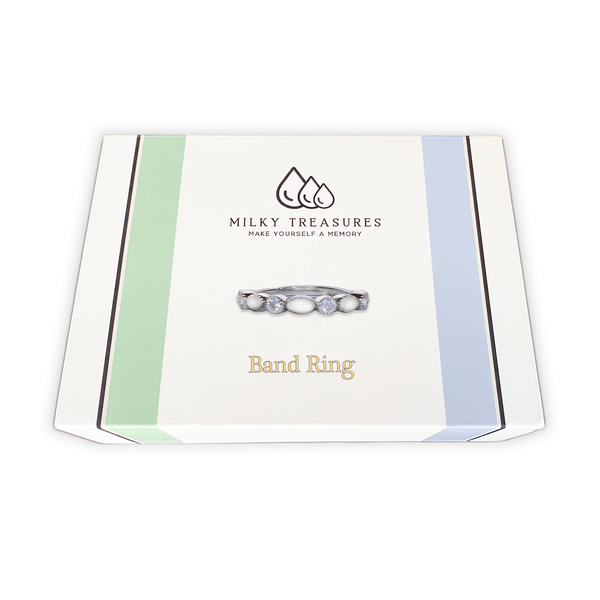 - A beautiful band ring setting made of 925 sterling silver and 4 cubic zirconias that can be adjusted from size 6 to 10 (US). Enjoy the process of creating small breast milk stones that will rest inside the cavities of the ring.